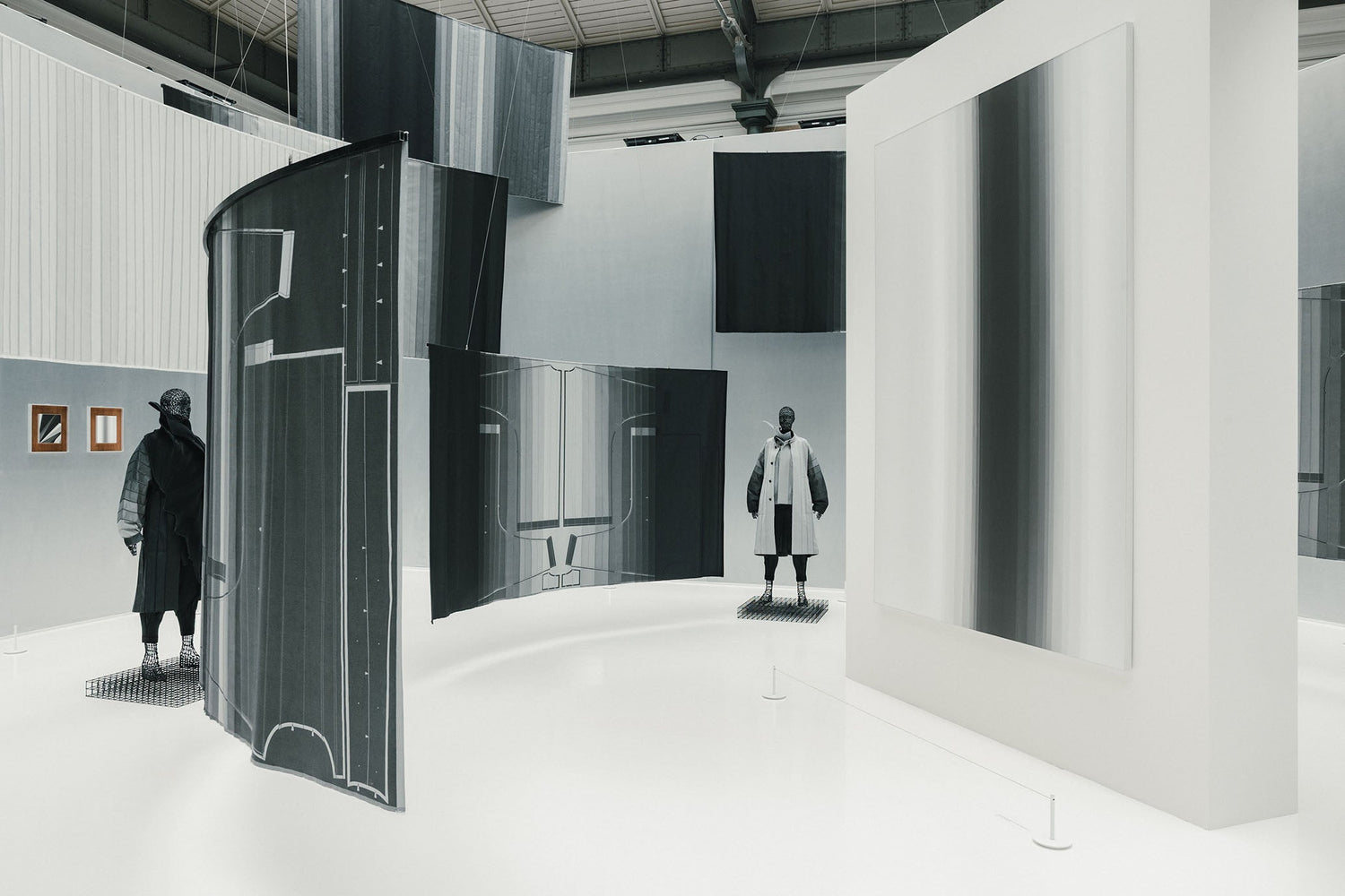 Inspired by the monochrome expression of the “Light and shadow inside me” series, A-POC ABLE created a piece of cloth that achieves this gradation using only two colours, black and white, structured around the relation between warp and weft. In this special exhibition, a single piece of fabric traversed the space, allowing light and shadow and both two and three-dimensional elements to quietly resonate together.