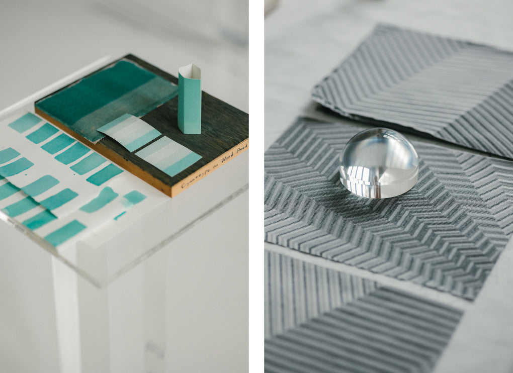 In the sample room of the atelier. While examining materials such as soil, bricks, and tiles, they discuss selecting materials rooted in place and collaborating with artisans, conversations that extend beyond architecture and clothing.