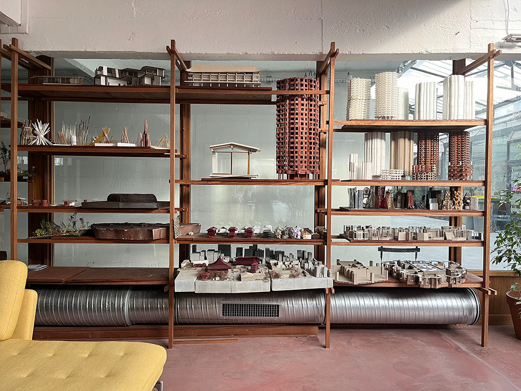 Original shelving, designed and built by the team themselves, to organise and display models and material samples. The 700㎡ atelier is not just a workspace, but also a place for experimentation and research, where they explore the potential of a site with their own hands.