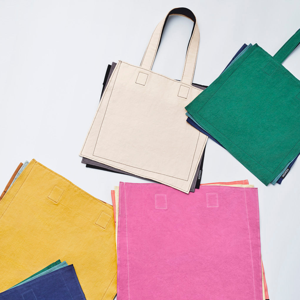 Tote bags with a fun design that looks like three pieces of coloured paper. They have a two-layered structure that makes it easy to organize your items. They are lightweight and easy to carry, and you can use them without worrying about wrinkling.