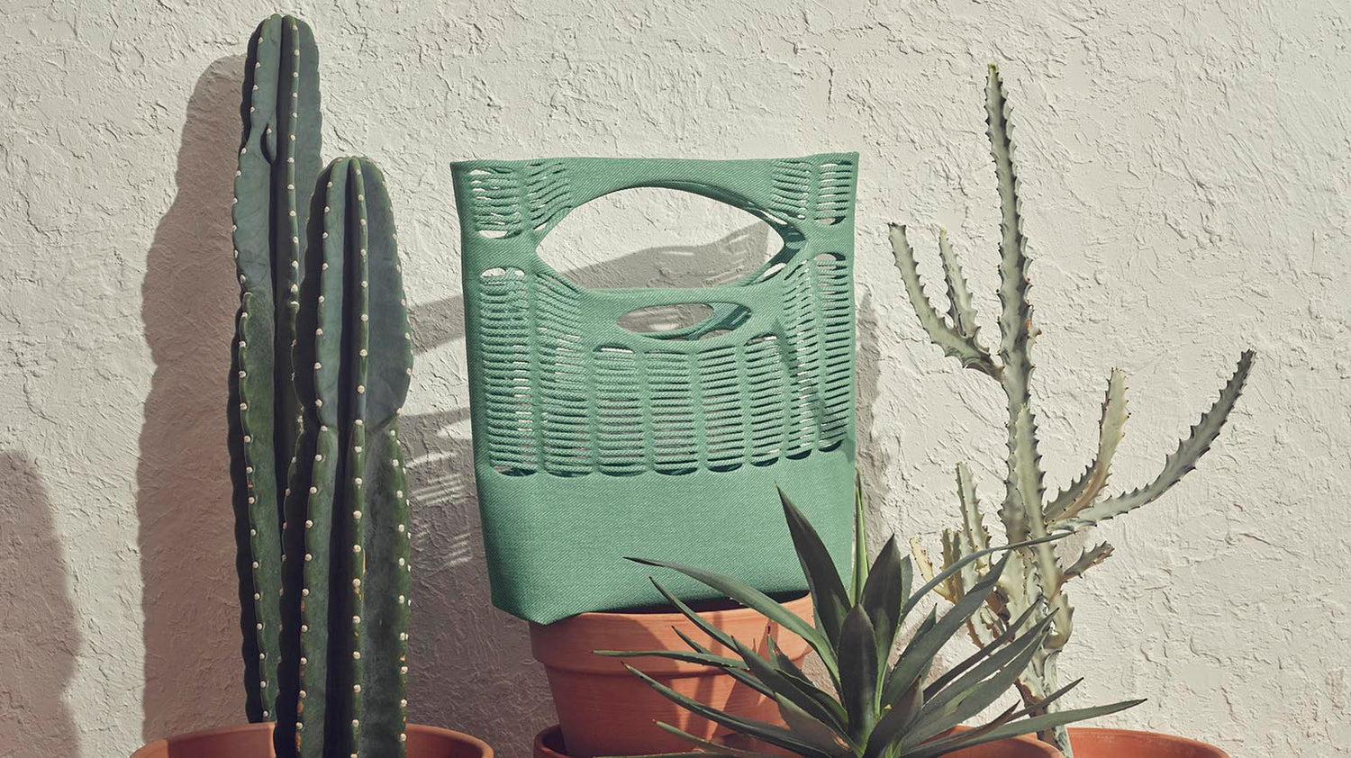 An item that reuses fishing nets that have been collected after they have served their purpose and makes use of the “knitting” design that is characteristic of MOKKO. Development began by turning fishing nets back into fine chips and remaking yarns combined with nylon for knitting. The finished bag inherits the properties of the original material and is strong, lightweight and suitable for everyday use.