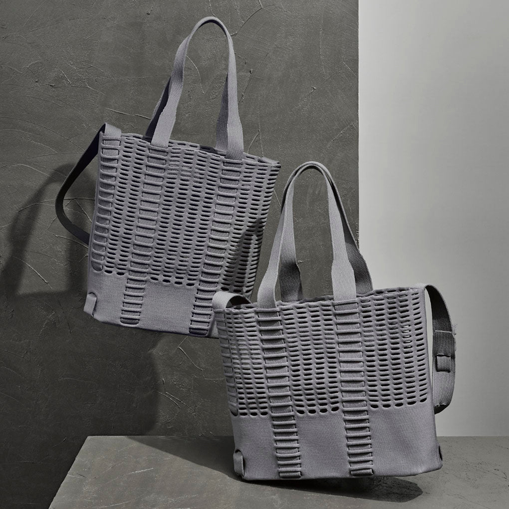 This tote bag features a functional design with slits. The firm gusset is shaped by folds, and can be folded in or out, depending on the preferred storage capacity. The handles are woven from a single thread, just like the main body of the bag, in pursuit of a simpler, more integrated look. This item is made using less sewing and instead focusing on the knit manufacturing method.