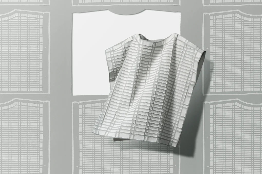 TYPE-B uniquely combines bonding, which pastes different materials together, and print processing techniques to create textured, geometric patterns. The graphic and richly textured fabric also gives the garments a three-dimensional form. Various arrangements of the patterns are possible when worn.