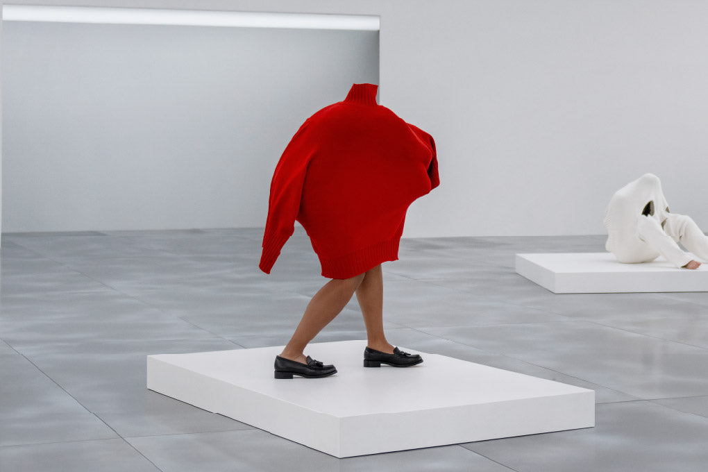 Fit your head, arms and legs, and body into a piece of knit or a pair of pants, assume a position, and hold that position—as if you were a sculpture. Created with the original concept by Austrian artist Erwin Wurm, a series of performative works titled One Minute Sculptures set in motion the presentation of the Autumn Winter 2025/26 collection at Carrousel du Louvre in Paris.