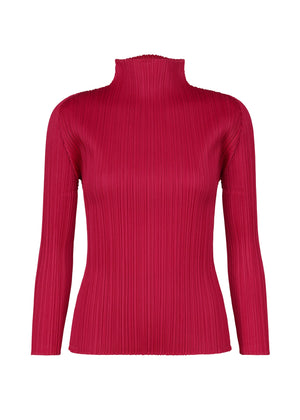 This carmine pleated top has long sleeves and a wide mock neckline.