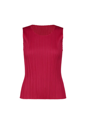 This sleeveless carmine pleated top has a scoop neckline. It may be worn backwards for a straight neckline and scoop back.