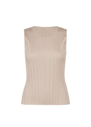 This sleeveless greige pleated top has a scoop neckline. It may be worn backwards for a straight neckline and scoop back.