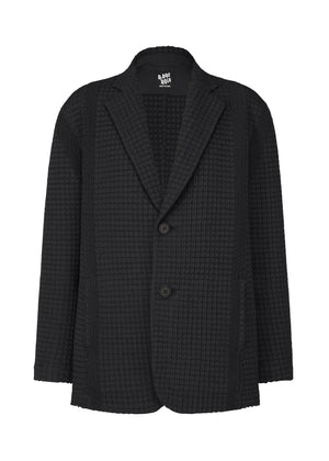TYPE-O 014 is enhanced by applying grid-style pleating achieved with the 'Steam Stretch' technique, creating a richly textured surface. The intricate pattern of special heat-sensitive threads is woven into each piece of clothing; when steam is applied, three-dimensional forms emerge and the garment is completed.